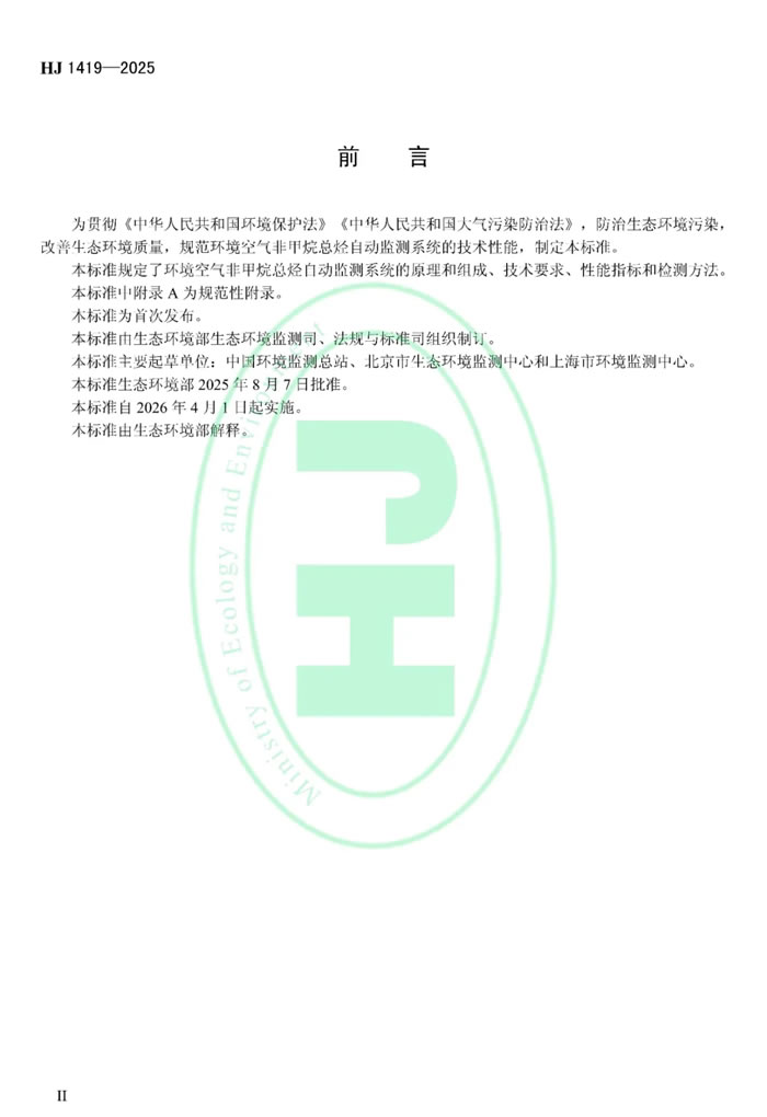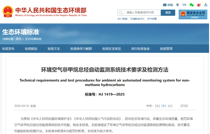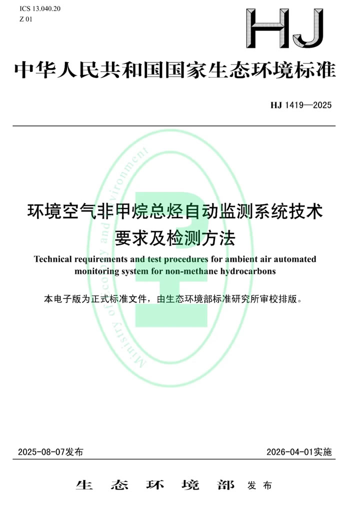 為貫徹《中華人民共和國(guó)環(huán)境保護(hù)法》《中華人民共和國(guó)大氣污染防治法》,防治生態(tài)環(huán)境污染,改善生態(tài)環(huán)境質(zhì)量,規(guī)范環(huán)境空氣非甲烷總烴自動(dòng)監(jiān)測(cè)系統(tǒng)的技術(shù)性能,生態(tài)環(huán)境部制定國(guó)家生態(tài)環(huán)境標(biāo)準(zhǔn)《環(huán)境空氣非甲烷總烴自動(dòng)監(jiān)測(cè)系統(tǒng)技術(shù)要求及檢測(cè)方法(HJ 1419—2025)》。本標(biāo)準(zhǔn)為首次發(fā)布,自2026年4月1日起實(shí)施。