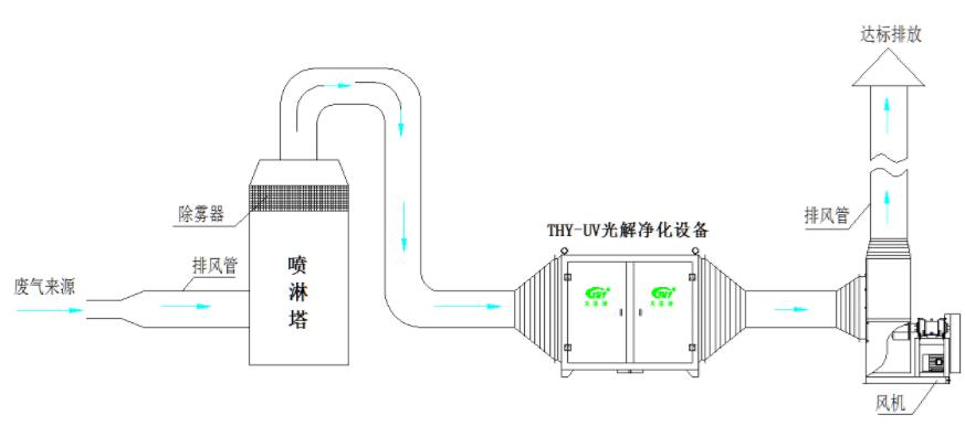 污泥臭氣處理考慮運(yùn)營(yíng)成本及安全性,本方案工藝路線擬定采用“通風(fēng)系統(tǒng)(風(fēng)機(jī)、收集罩、管道)+預(yù)處理系統(tǒng)(水噴淋)+核心凈化系統(tǒng)(UV光解凈化設(shè)備)”來進(jìn)行污泥臭氣處理。工藝設(shè)備圖如下: